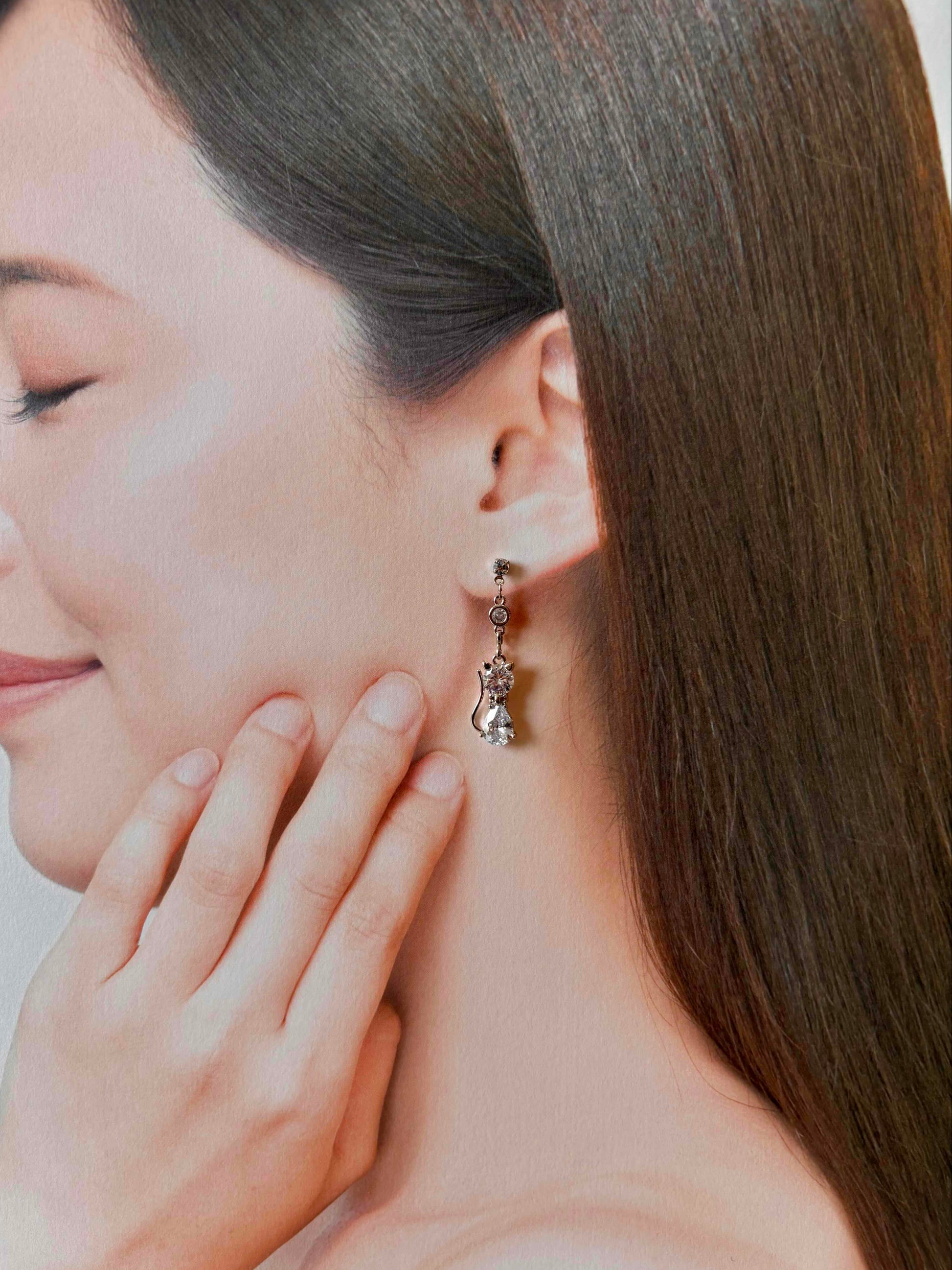 ネコちゃんモチーフのキラキラピアスは、クリアカラーでどんな季節にもぴったり。