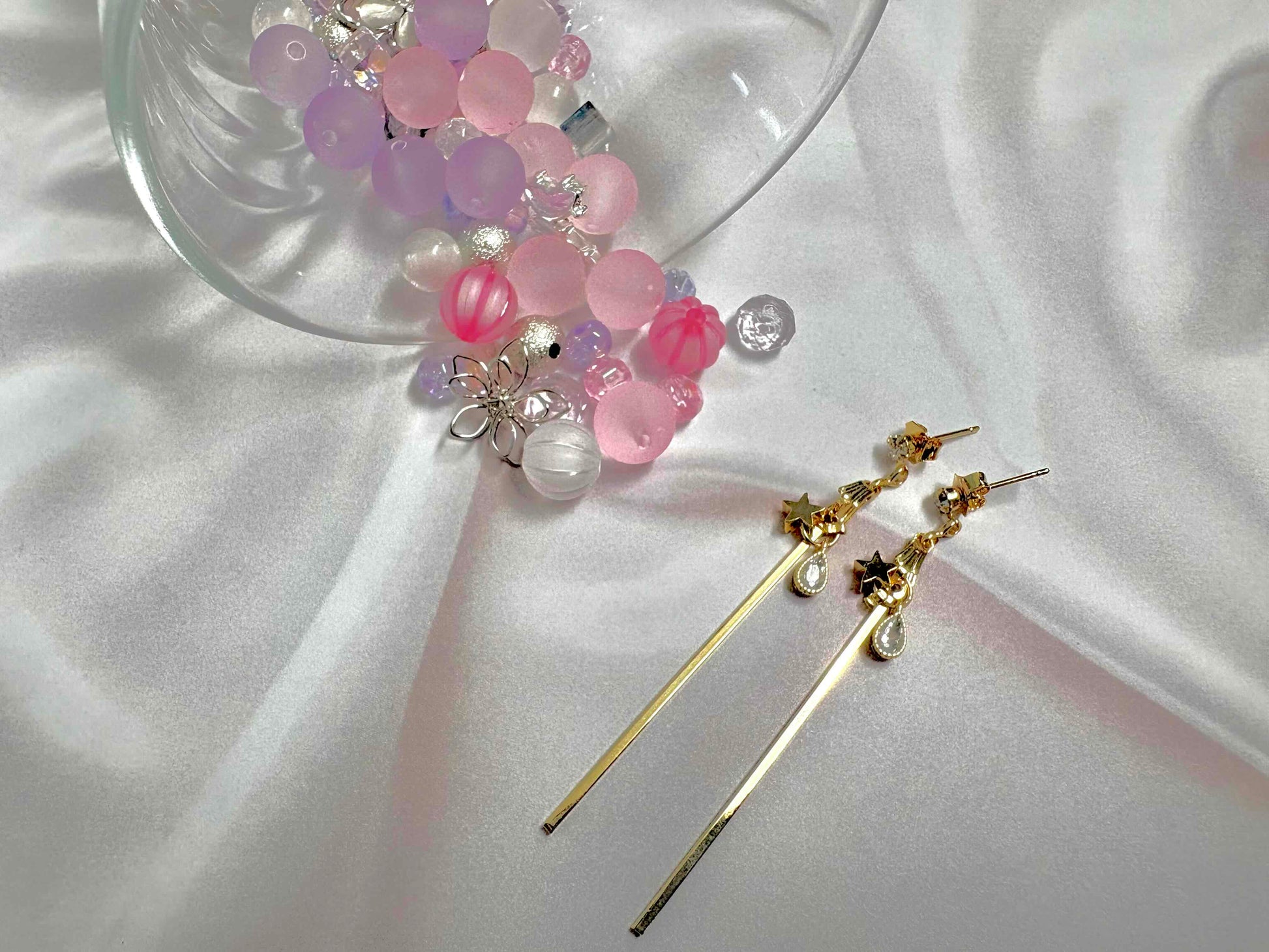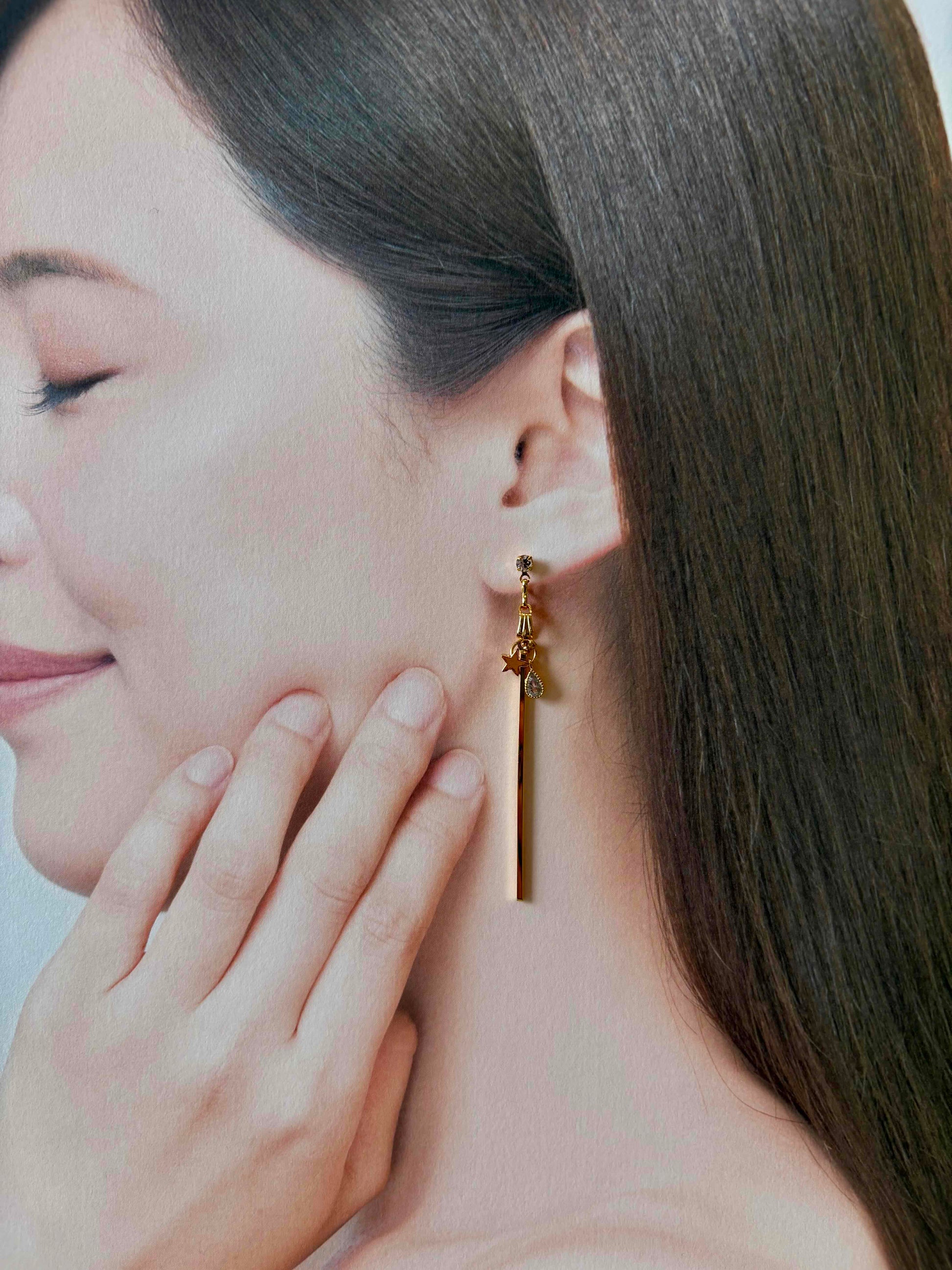 星と光る雫をイメージしたピアスは、遊び心あふれるデザインで耳元を華やかに彩ります。